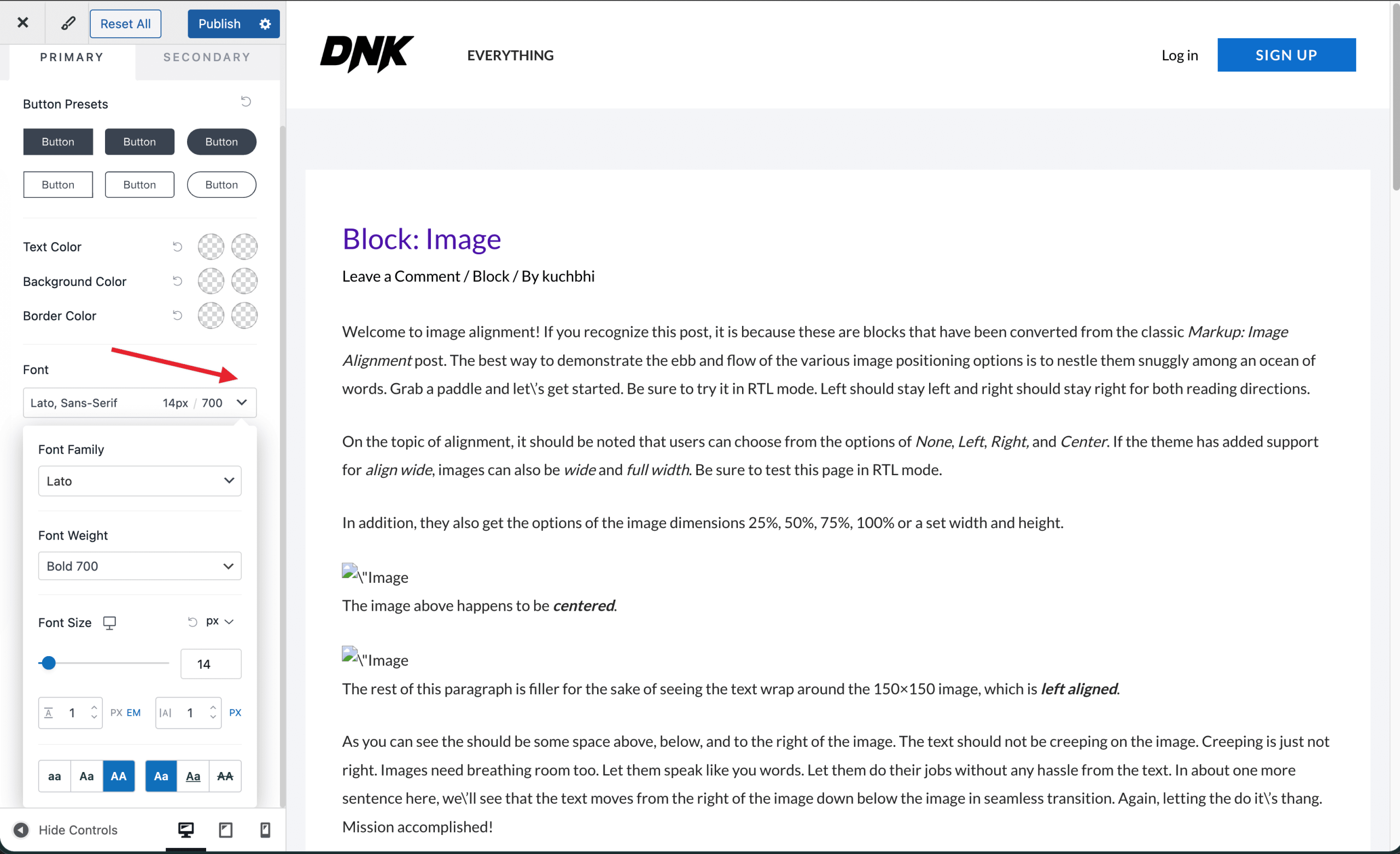 - Font: The font option lets you change the font family, font weight, font size, capitalization, and font decorations as well. Simply click on the pencil icon next to the font option to open the font menu.