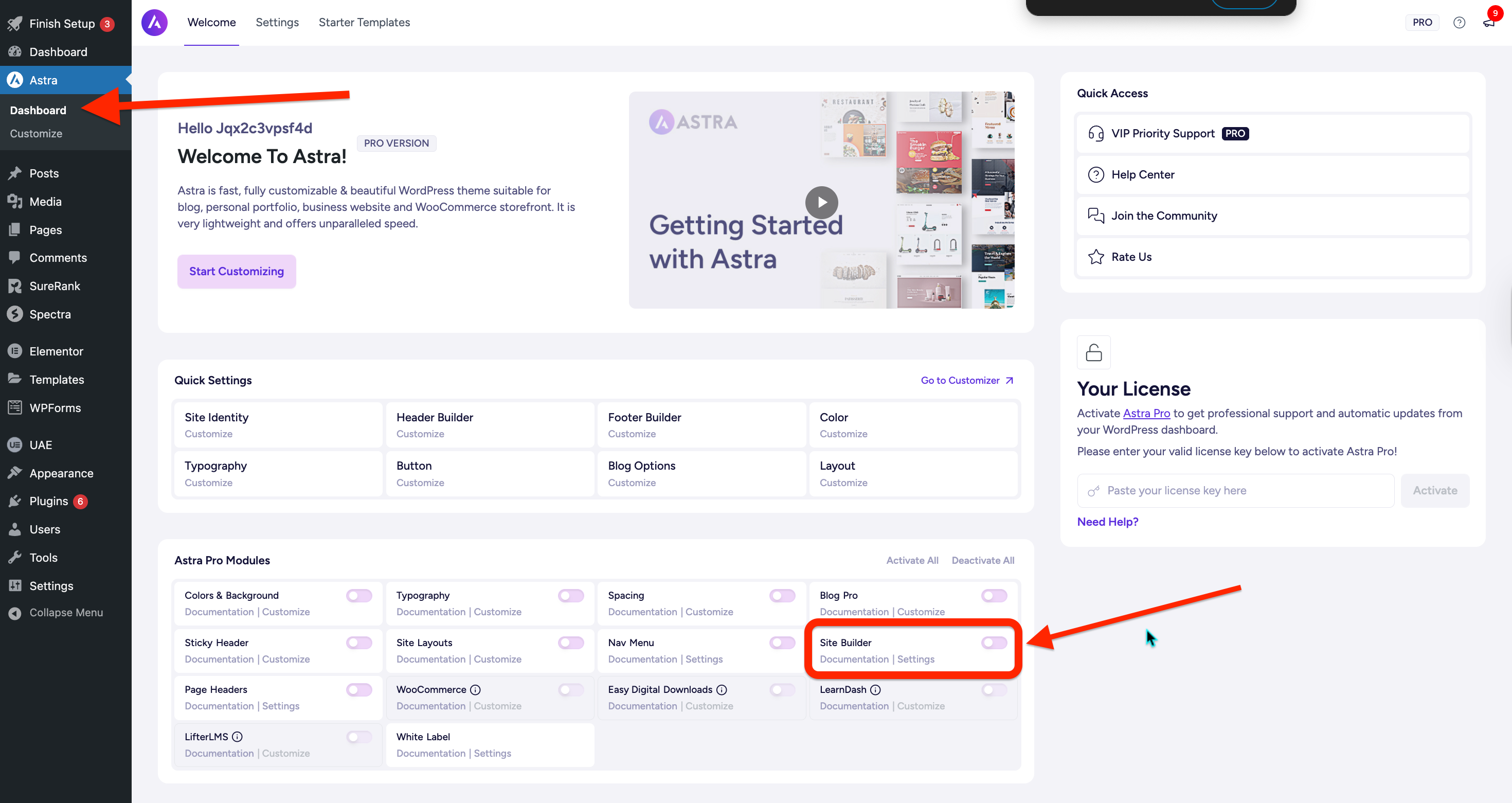 After that, go to the WordPress dashboard, click on Astra, then Astra Pro Modules, and switch on the Site Builder toggle.