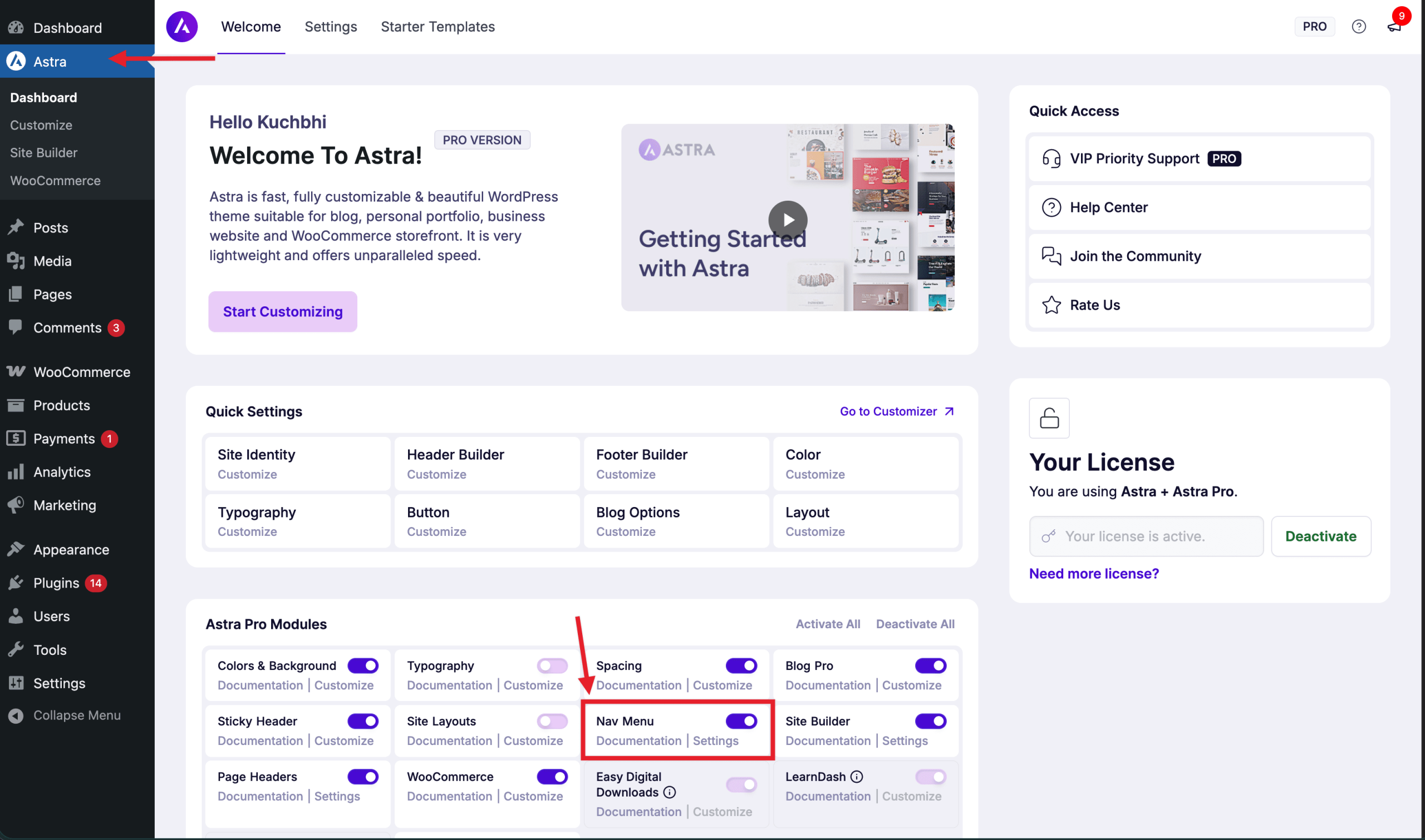 Step 2 – Activate the add-on from the WordPress Dashboard → Astra → Dashboard → Nav Menu