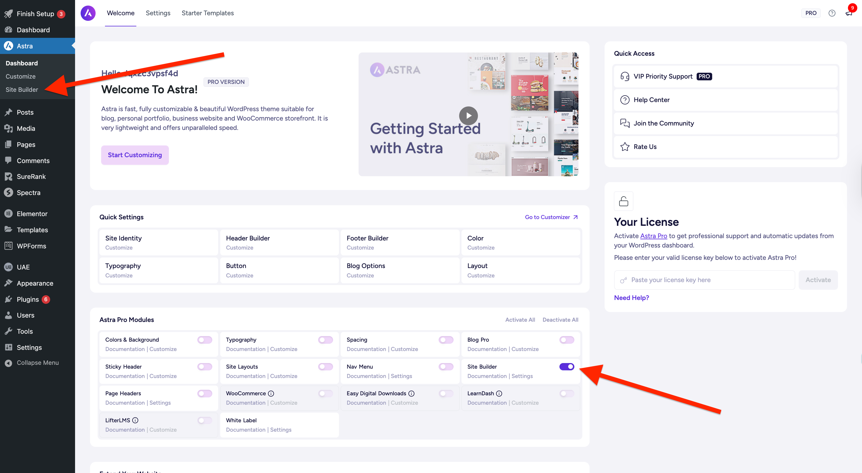 1. First, activate the Site Builder module of Astra Pro. This will require installing the Astra Pro Addon plugin. If you have not already installed it, please check this installation guide.