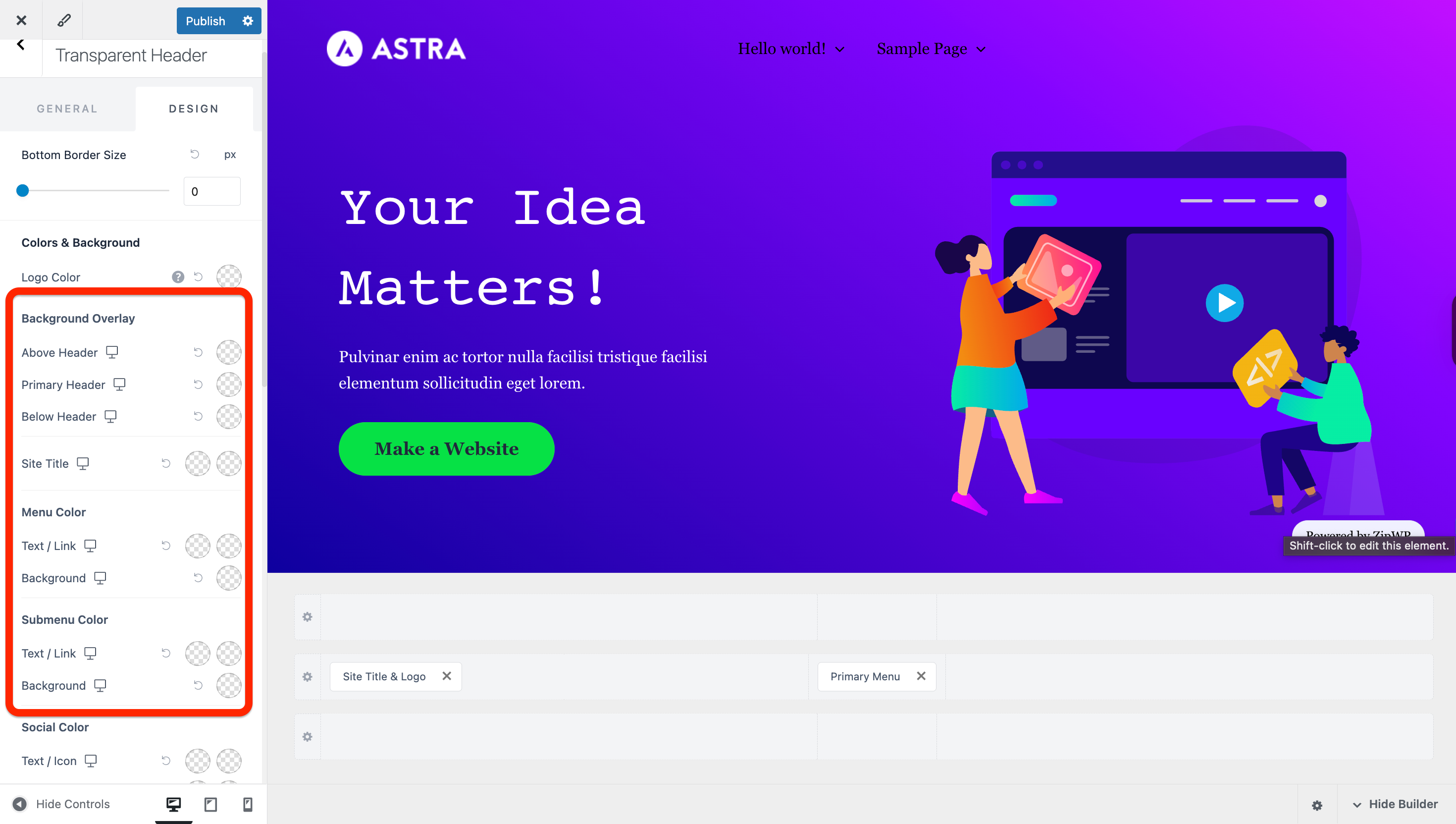 Transparent header design settings are available in the customizer under Header > Transparent Header > Design tab. Set different colors for a transparent header with the following options –